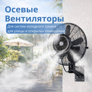 Настенные вентиляторы для эффективного охлаждения террас и открытых площадок. Усиливают эффект системы холодного тумана и обеспечивают равномерное распределение воздуха.